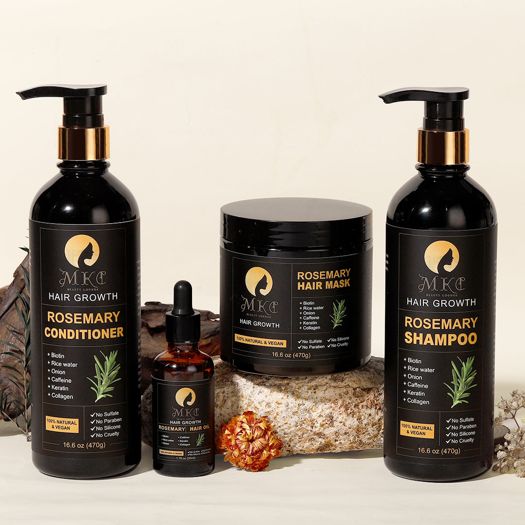 Transform your hair care routine with our complete Rosemary Hair Growth Set. Featuring a shampoo, conditioner, hair mask, and hair oil infused with biotin, rice water, onion extract, caffeine, keratin, collagen, and the natural power of rosemary, this set is designed to stimulate the scalp, boost growth, strengthen strands, and restore shine. Achieve visibly thicker, healthier hair with every step.